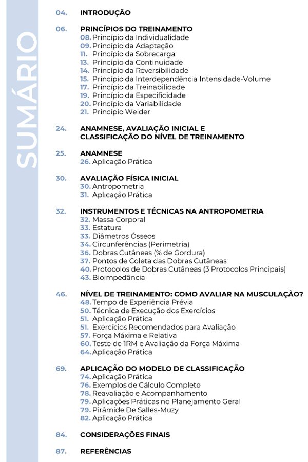 Com mais de 2 décadas de pesquisa e prática, o Prof. de Salles reuniu neste manual os princípios do treinamento, ferramentas para avaliação do condicionamento físico e do nível de treinamento na musculação que transformam a avaliação em uma verdadeira ferramenta de prescrição individualizada.